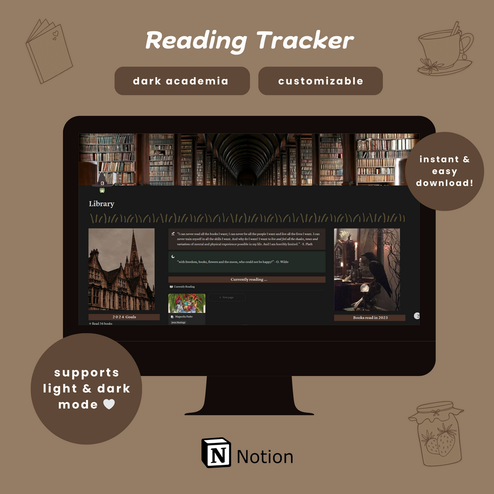tags: dark, dark academia, academia, library, book, books, notion, notion template, template, brown, dark brown, aesthetic